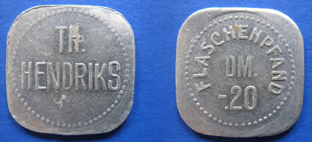 Schlagworte: abgerundete EckenFlaschenpfandmarkeTh. Hendriksunbekannter AusgabeortWertmarke